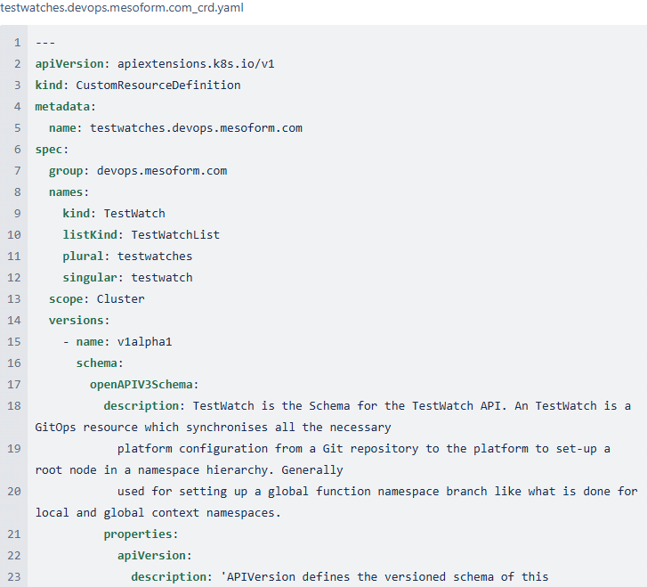 Our custom resource definition is as follows and for the purpose of the example, you could just create this with a kubectl apply -f testwatches.devops.mesoform.com_crd.yaml and test. However, we have controller code watching this resource so we can demonstrate a set of events.